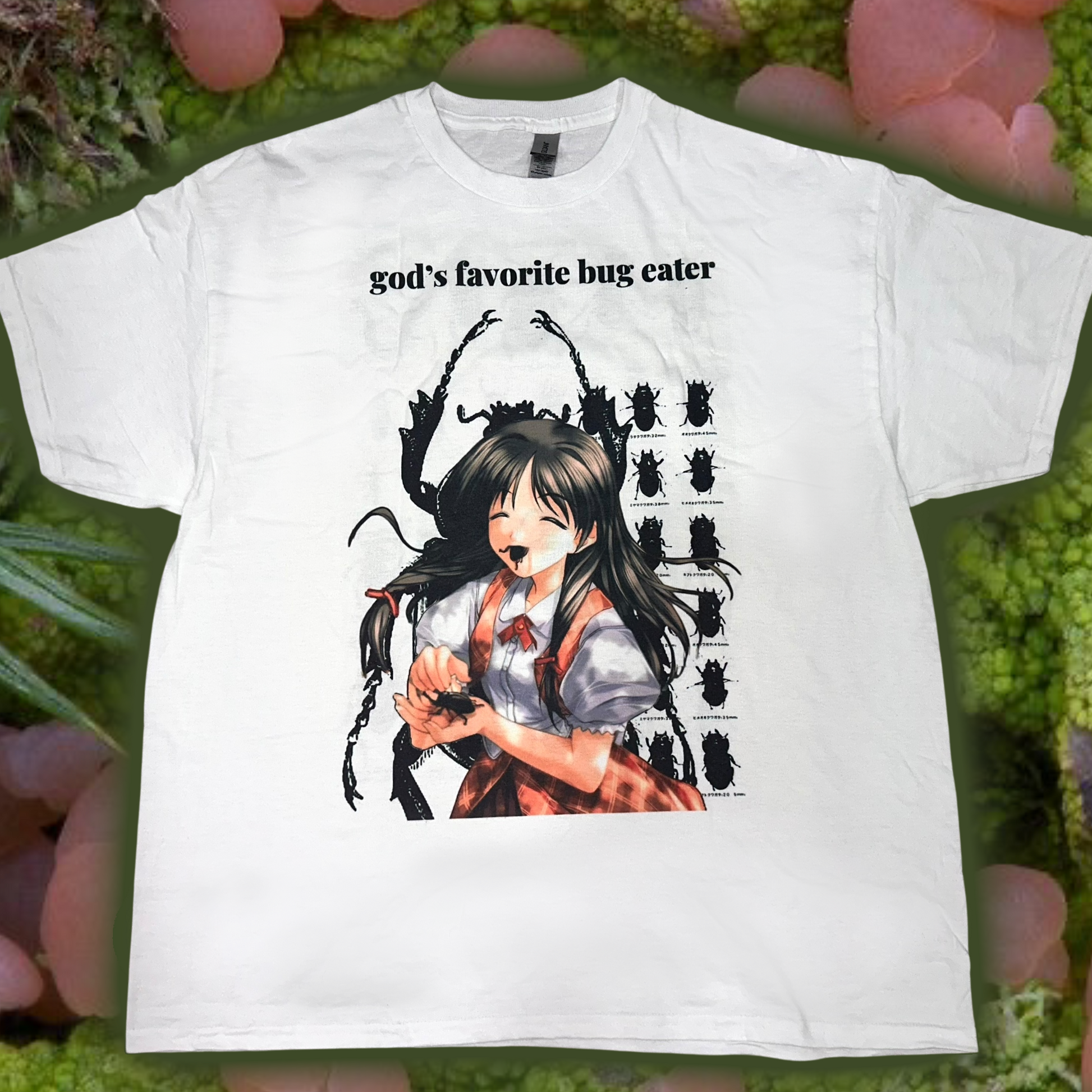 anime girl eating black beetles double sided graphic printed on unisex tshirt gildan dryblend 50% cotton 50% polyester
