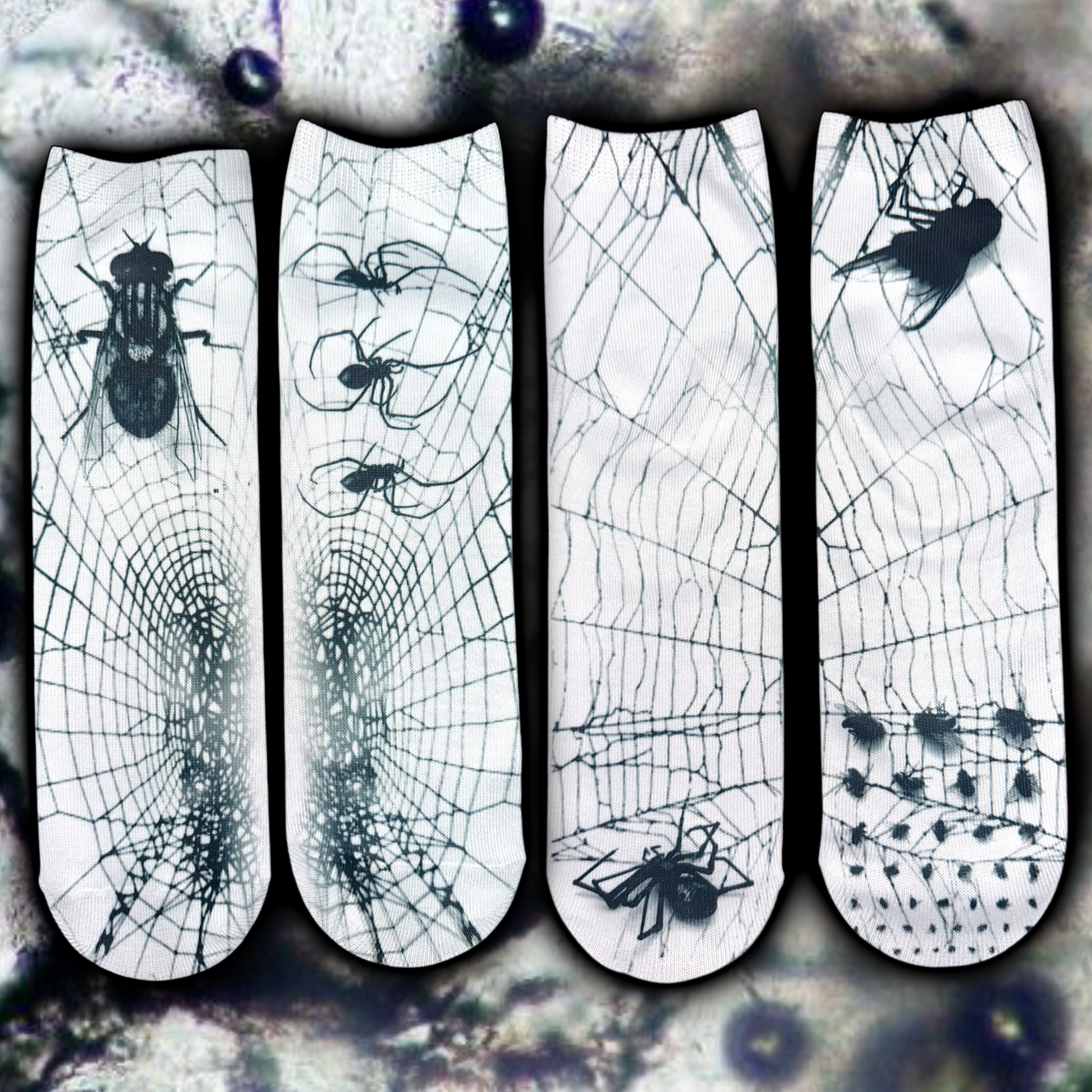 valiant tale of the battle between fly and spider. who is really caught in this web? each sock tells a story of a different victor.